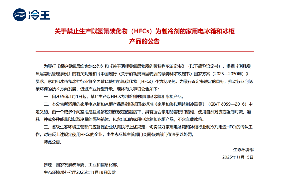 自2026年1月1日起,我国《蒙特利尔议定书》框架下的制冷剂及温室气体管控进入实质性深化阶段。依据生态环境部公告,家用冰箱冰柜行业将全面禁止生产以氢氟碳化物(HFCs)为制冷剂的产品。此禁令是2024年HFCs配额管理政策的延伸,对高全球变暖潜能值(GWP)的HFCs、消耗臭氧层的含氢氯氟烃(HCFCs)形成更严格约束,技术准备度不同的下游行业正面临分步骤抬高的合规门槛。
